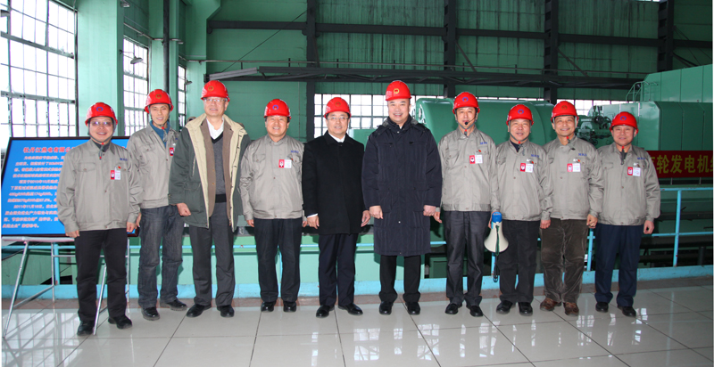 在國產(chǎn)首臺、國內(nèi)最大的80MW背壓式供熱機(jī)組前、副省長劉國中、市委書記張晶川與公司班子成員合影