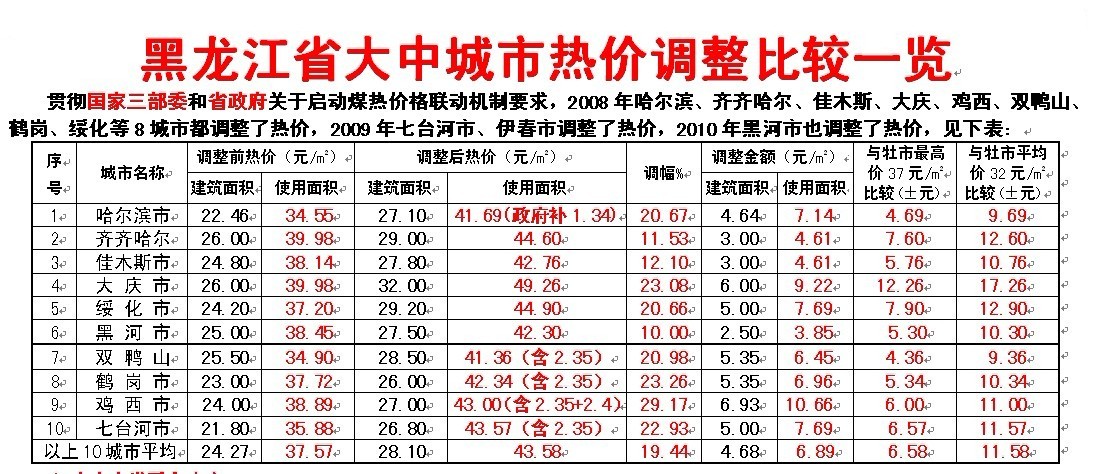 黑龍江省大中城市熱價調(diào)整比較一覽